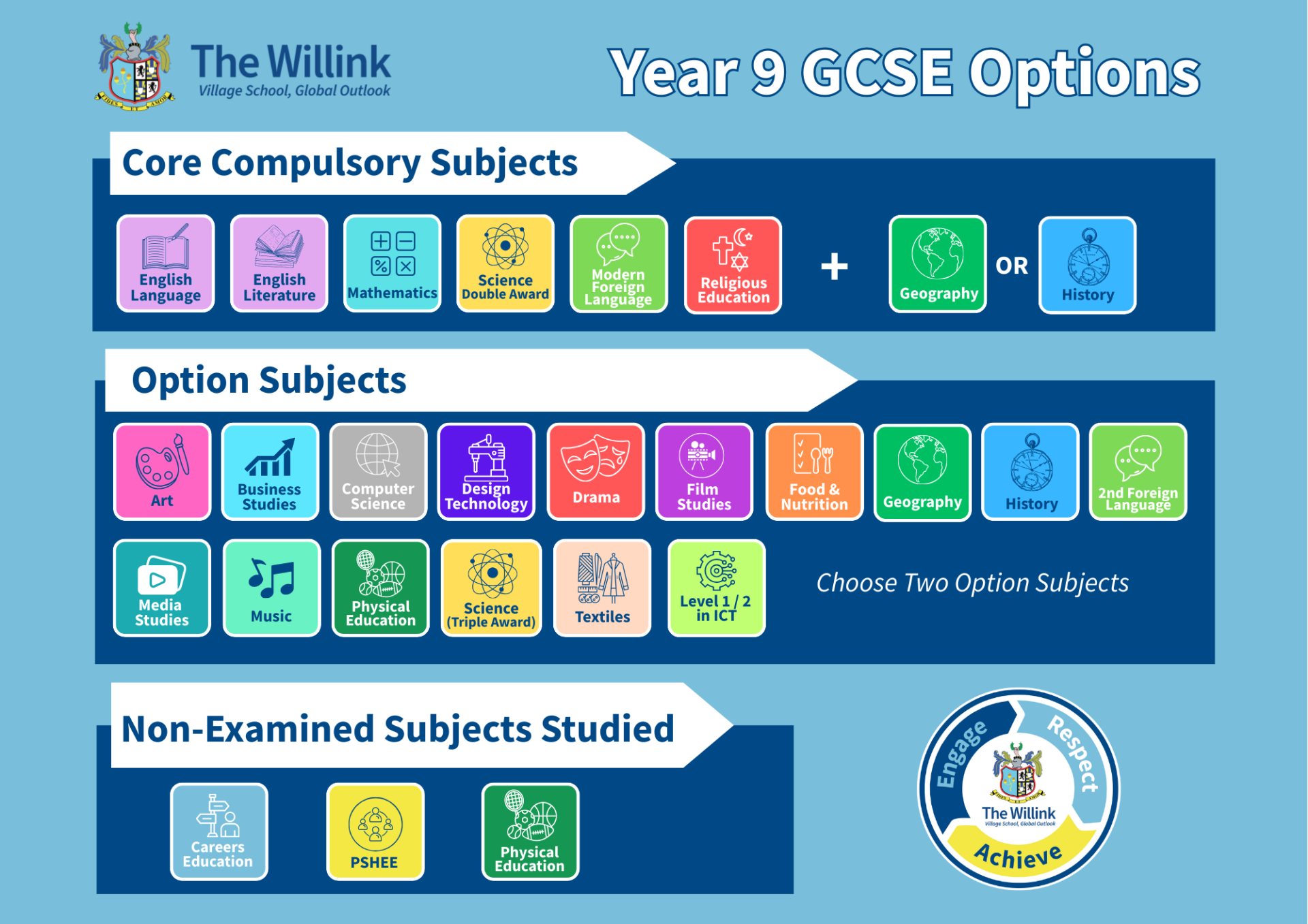 To learn more about core subjects and option subjects available to students, please review the Year 9 Options Booklet: