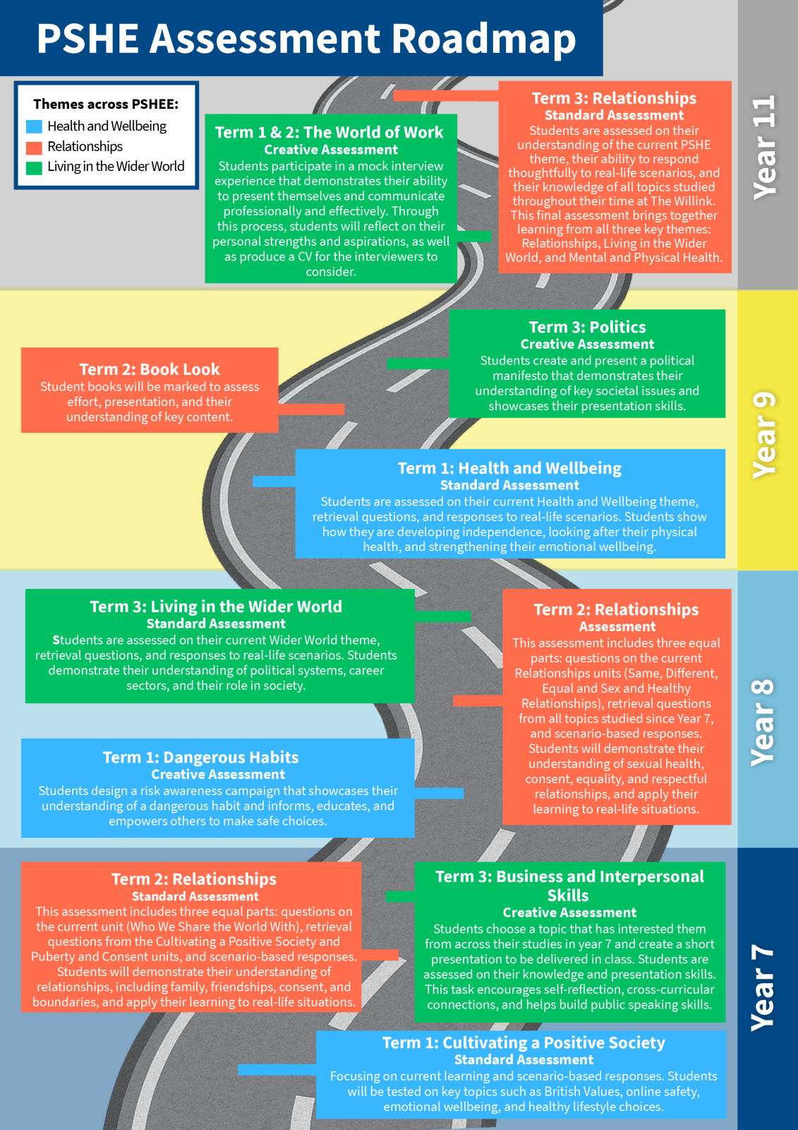 By the end of Key Stage 4, students will have developed the knowledge and attributes outlined in the Department for Education’s statutory RSHE guidance, enabling them to make informed choices, maintain respectful and healthy relationships, and contribute positively and responsibly to society. This aligns with The Willink’s vision to ensure students are confident, respectful and resilient global citizens with the knowledge and skills to be successful in 21st Century.