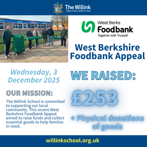The Willink School and Sixth Form is proud to support our local community, and following the success of previous collections, we were delighted to raise funds and collect essential goods for the West Berkshire Foodbank this December. Part of the Trussell Trust’s national network, the Foodbank provides emergency food and vital support to people in crisis while campaigning for long-term change. With rising demand locally and across the UK - where 16 million people, including 5.2 million children, live in poverty - every donation makes a real difference.