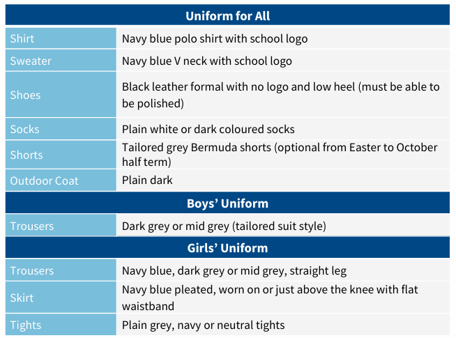 Students are permitted to wear tailored grey Bermuda shorts from Easter to October half term. They are available to purchase from David Luke.